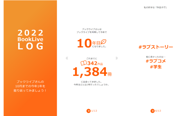 「BookLive LOG」の2022年版である「2022 BookLive LOG」は、2022年1月1日から2022年10月31日までのユーザーご自身のブックライブの購入履歴やアプリの使用履歴から、期間中の読書活動を振り返ることができる機能です※。これまでに読んだ作品の購入数や、お買い物金額の総計、購入した作品の感情タグ、アプリで作品を読んだ時間の総計などを見ることができます。