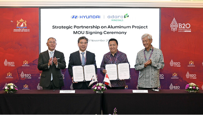 ソウル/バリ、2022年11月13日 - Hyundai Motor CompanyとPT Adaro Minerals Indonesia Tbk.(AMI)は本日、自動車製造向けのアルミニウムの需要が高まる中、アルミニウムの安定供給を確保するための覚書(MoU)に署名しました。この協力は、AMIが子会社のPT Kalimantan Aluminium Industry(KAI)を通して行うアルミニウムの生産と供給に関して、双方にとって有益で包括的な協力体制を確立するためのものです。