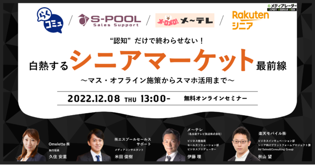 株式会社アイズ(所在地:東京都渋谷区、代表取締役社長:福島範幸)が運営するNo.1*の媒体資料ポータルサイト「メディアレーダー」は、12/8(木)にマーケティングセミナーイベント、第8回 メディアレーダー EXPERT WEBINAR WEEK 2022冬にて、「『認知』だけで終わらせない! 白熱するシニアマーケット最前線 ~マス・オフライン施策からスマホ活用まで~」を開催します。シニアマーケティングについての専門家たちが登壇するオンラインセミナーで、参加申し込みは無料です。