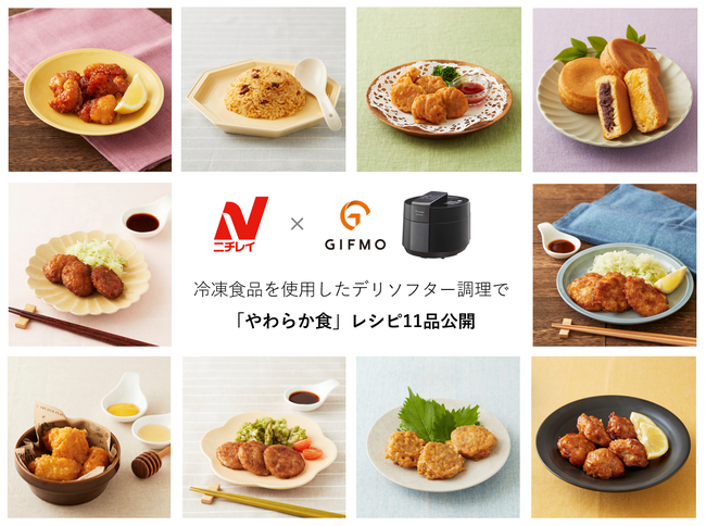 ギフモ株式会社(本社:京都市下京区、代表取締役:森實 将、以下 ギフモ)は、この度、株式会社ニチレイ(本社:東京都中央区、代表取締役社長:大櫛 顕也、以下ニチレイ)と協業し、ニチレイの冷凍食品を、ギフモの販売する調理家電「デリソフター」で調理する、「やわらか食」に特化したレシピ11品を「デリソフター」公式サイトのレシピぺージにて公開いたしました。