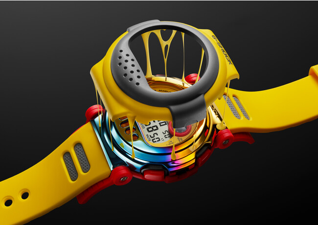 「DW-001」のソフトなフォルムはそのままに、樹脂ベゼルを取り外すとメタルベゼルが現れるカプセルトイのような構造を採用しました。樹脂ベゼルには「DW-001」を踏襲したツートンカラーを取り入れました。一方、メタルベゼルは部分ごとにヘアラインやミラー加工を施し質感を高めています。樹脂ベゼルとメタルベゼルそれぞれの特長を引き出し、ポップでありながらもクールさを兼ね備えたモデルに仕上げました。