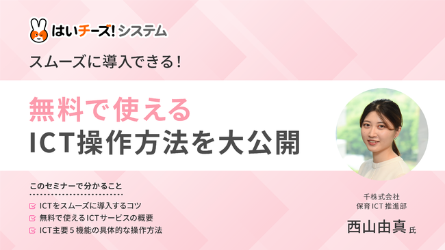 ICTで保育士の働き方改革や保育業界のDXを推進し、子どもの幸せをつくることを目指す千株式会社(本社:東京都千代田区、代表取締役社長 千葉伸明、以下 当社)は、保育ICTの活用を検討する先生や自治体の方へ向けて、無料オンラインセミナー「スムーズに導入できる!無料で使えるICT 操作方法を大公開」を開催いたします。
