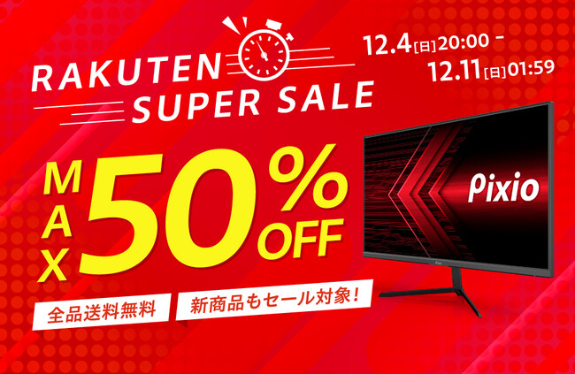 スマートフォングッズの商品開発、及び通販サイトを運営するHamee(ハミィ)株式会社(本社:神奈川県小田原市、代表取締役社長:水島 育大、証券コード:東証プライム3134)は、2022年12月4日 (日) 20:00~12月11日 (日) 01:59まで楽天市場で開催される「楽天スーパーSALE」にて、「Pixio(ピクシオ)」のゲーミングモニター「PXC325」と「PX274P」を合計50台限定で50%OFFにて販売します。また、同店で取り扱う全商品を対象に最大20%OFFセールも実施します。