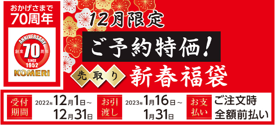 毎年、お客様から大変ご好評をいただいておりますコメリ「新春福袋」の予約販売を今年も開催いたします。コメリが自信をもってご提供する工具、家電、インテリア、自転車、農業資材など、約50種類をご用意。大変お得な価格でご購入いただけます。また、同期間で「リフォーム福袋」の予約受付も開始いたします。キッチンやバスルーム、トイレなどお得なリフォームプランをご用意しております。ぜひご覧ください。