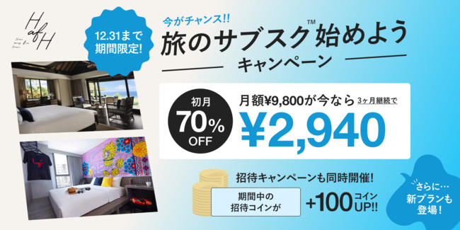 また、新プランの開始に合わせて、12月5日(月)~12月31日(土)の期間、「旅のサブスク(TM)️始めようキャンペーン」を開始します。