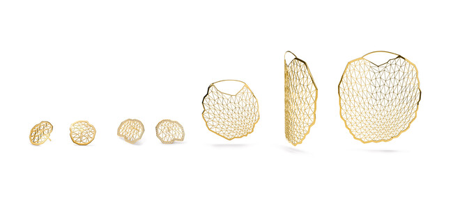 生き生きとした模様や形を紡ぎ出す「ニーシング・トピア ビジョン」。表情豊かなフォルムがジュエリーに独特の躍動感を与え、光沢のある表面が光を反射し、周囲の色彩を取り込みます。本来はずっしりと重量感のあるゴールドがまるで溶けているかのように周囲の光と反応してシャボン玉のように煌めきます。