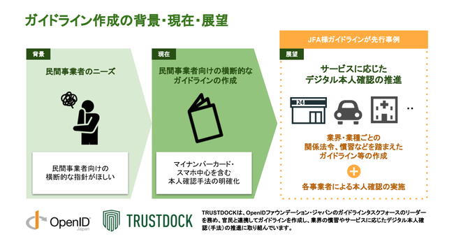 TRUSTDOCKは、OpenIDファウンデーション・ジャパンのガイドラインタスクフォースのリーダーを務め、携帯電話キャリアやクレジットカード会社等複数の民間事業者とともに、民間事業者ガイドライン案を作成し、2023年3月にリリースする予定です。タスクフォースには、デジタル庁や有識者も参加しており、官民で連携してガイドライン作成に取り組んでいます。