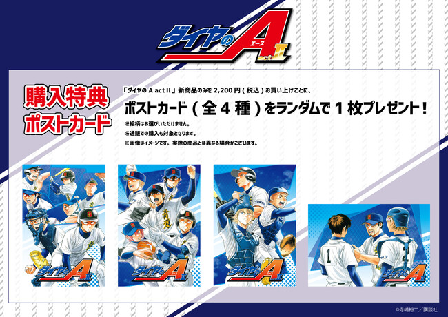『ダイヤのA actII』の新商品のみを2,200円(税込)お買い上げごとに、ポストカード(全4種)をランダムでプレゼント! 青道高校野球部の面々が印刷されたポストカードは、すべて揃えて、お部屋に飾りたいところ。
