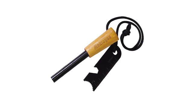 特徴:持ち手部分がウッドのファイヤースターター。ブレードは5cmまで測れるミリ単位スケールと、地図に使える5km縮尺目盛り付き。栓抜きとしても使えて利便性が抜群。