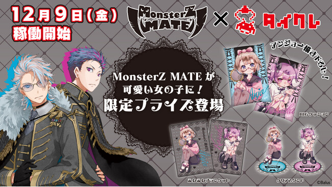 株式会社タイトー(本社:東京都新宿区)が運営する、いつでもどこでもクレーンゲームが楽しめる「タイトーオンラインクレーン(以下タイクレ)」は、男性2人組Vtuber音楽ユニット「MonsterZ MATE」とコラボレーションし、タイクレのみで獲得できる限定プライズを12月9日(金)から展開いたします。さらに展開時にはMonsterZ MATE公式YouTubeチャンネルにて、お2人がタイクレに挑戦する動画が公開されます。