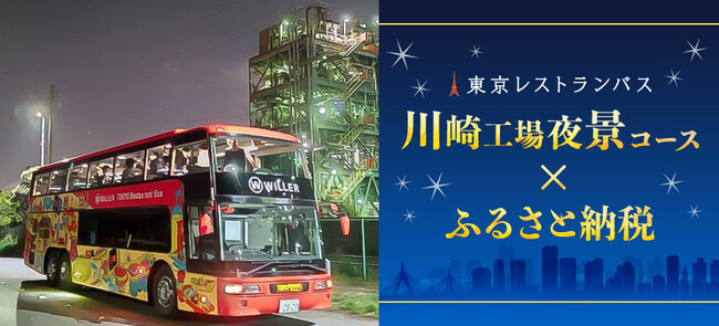 WILLER EXPRESS 株式会社(本社:東京都江東区、代表取締役:平山幸司、以下「ウィラーエクスプレス」)は、川崎市が実施する「ふるさと納税」の返礼品として、東京レストランバスの川崎工場夜景コース『フレンチとお酒と川崎工場夜景を楽しむ夜』(https://travel.willer.co.jp/restaurantbus/tokyo/plan05.html)を提供します。納税は、川崎市が連携する各種ふるさと納税ポータルサイトより、本日12月5日(月)から手続き可能です。