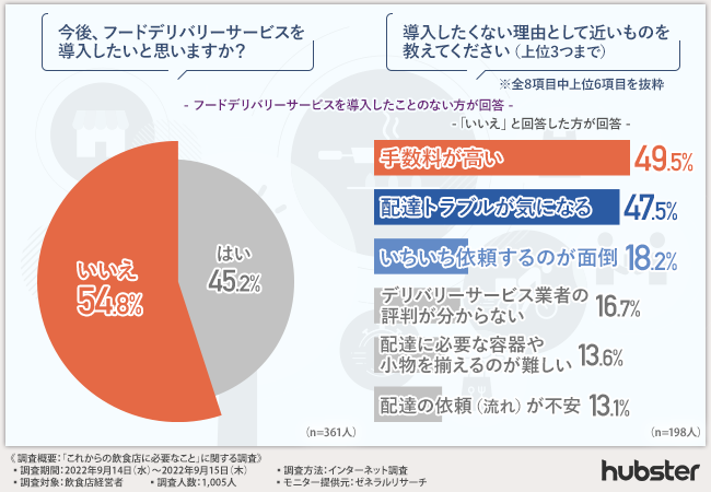 そこで、「導入したくない理由として近いものを教えてください(上位3つまで)」と質問したところ、『手数料が高い(49.5%)』と回答した方が最も多く、次いで『配達トラブルが気になる(47.5%)』『いちいち依頼するのが面倒(18.2%)』『デリバリーサービス業者の評判が分からない(16.7%)』『配達に必要な容器や小物を揃えるのが難しい(13.6%)』『配達の依頼(流れ)が不安(13.1%)』『配達時間が気になる(9.6%)』と続きました。