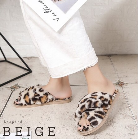 冬らしいレオパード柄の4色展開で、足に触れる部分がふわふわとして気持ちよい。オープントゥで蒸れにくく長時間履いても快適。