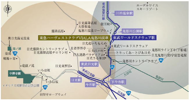 本施設は、都心から約 2時間でアクセス可能な鬼怒川・日光エリアに位置し、 1992 年に開業し今年30周年を迎えた 「東急ハーヴェストクラブ鬼怒川」の隣地でのプロジェクトとなります。「東武ワールドスクウェア」駅徒歩3分とアクセスが良く、駅前でありながら雄大な鬼怒川渓谷の自然を間近に感じられる好立地に位置します。日光東照宮やいろは坂、中禅寺湖などの日光エリア観光名所までも、容易に移動が可能です。