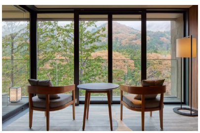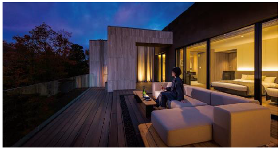 ゲストルームは57~ 152平方メートル のゆとりのある空間。すべてのお部屋に自家源泉の温泉を引いた露天風呂を用意いたしました。渓谷の自然を間近に感じながらゆったり湯に浸かる至福のひとときをお愉しみいただけます。最上階のシグネチャースイートタイプ(メゾネット・ 152平方メートル )は 6人まで利用可能。 2層吹き抜けの開放感あるリビング、上階には温泉露天風呂を備えたウッドテラスを設けるなどペントハウスの醍醐味を満喫できるような設計となっております。また、コンサバトリータイプの客室もご用意。窓際に天井までのガラスウォールを設え、サンルームのような心地よい空間を実現。引き戸を閉めれば独立空間になるので、ワーケーションにも最適です。そのほか和洋室やペットと一緒に滞在できるお部屋などご利用目的に合わせて ご選択頂けるようになっております。