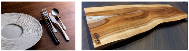 カトラリーやお皿は既存の「東急ハーヴェストクラブ」から使用しなくなったものを集め、エイジング加工や金継ぎを施し再利用をしている他、前菜プレートには地元「日光東照宮のご神木」を用いるなど、様々なサステナブルな取り組みを行っています。