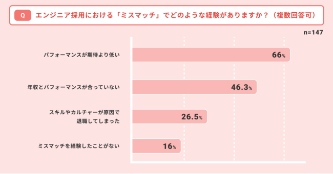 「エンジニア採用における『ミスマッチ』でどのような経験がありますか?(複数回答可)」という設問に対して「ミスマッチを経験したことがない」と答えたのは全体の16%でした。残りの84%はミスマッチを経験していることがわかります。