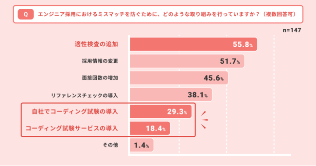 ミスマッチ防止策として「適性検査の追加」をしたのが56%で最多。コーディング試験導入は自社作成・他社サービス利用あわせて48%となった