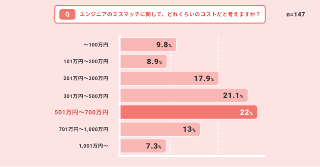 「エンジニアのミスマッチに関して、どれくらいのコストだと考えますか?」という設問に対して「501万円~700万円」と回答したのは22%と最多でした。次いで僅差の21.1%が「301万円~500万円」と回答しました。