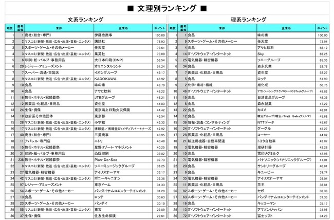 回答学生の所属する学校所在地および文理・男女で12区分を設定、文部科学省統計情報より男女文理別の学生数を推計し、ウエイトバック処理の母数とした。これに回答数を対比させウエイトバック値を算出。ランキング1位を100ポイントとした相対値によって2位以下のポイントを算出した。