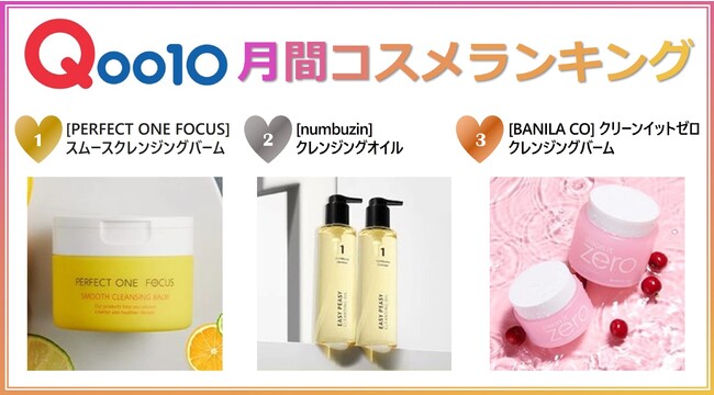 Qoo10(https://www.qoo10.jp/)サイト上、「洗顔・クレンジング」「リップ」「アイシャドウ」「チーク」カテゴリーの各販売個数に基づいたランキングです。