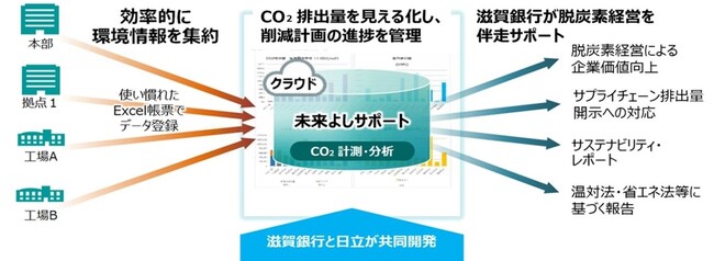 「未来よしサポート」は、日立製作所が大企業を中心に提供している環境情報管理サービス「EcoAssist-Enterprise*1」をベースに、中堅・中小企業向けに機能や操作性を設計したクラウドサービスです。拠点ごとに専用のExcel*2シートへ情報入力することで、容易に会社全体のCO2排出量を可視化し、排出量の推移や削減目標の達成状況の把握、削減計画の管理ができます。また、滋賀銀行では、CO2排出量管理ツールを自ら提供することで、お取引先のCO2排出状況の把握がしやすくなり、削減目標の設定や削減計画の立案、その先の実行やモニタリングまで一貫した伴走サポートが可能となります。