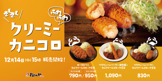 株式会社松屋フーズ(本社:東京都武蔵野市、代表取締役社長:瓦葺 一利)では、とんかつ専門店の「松のや・松乃家」におきまして、2022年12月14日(水)午後3時より、「カニクリームコロッケ」を発売いたします。