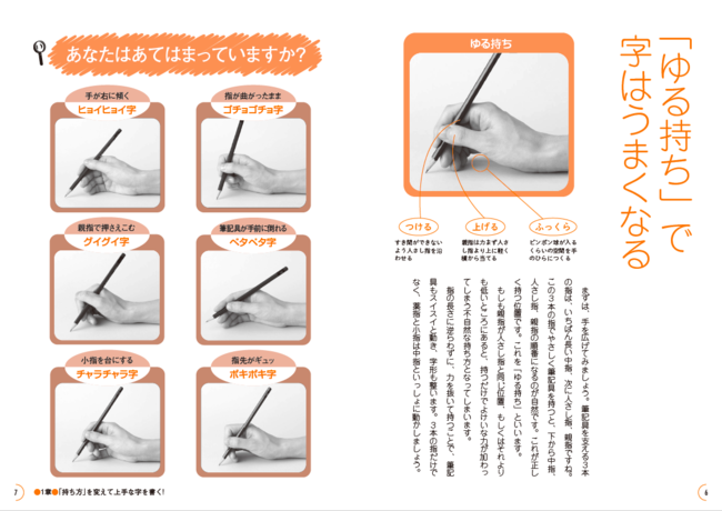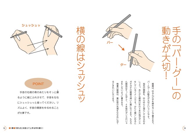 本書では、正しい持ち方で書くことで、たった1日で字がうまくなる驚きのメソッドを紹介しています。