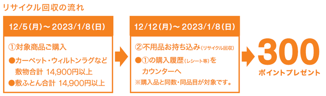 期間中、本リサイクル回収・実証実験にご参加いただいたお客様には、ご協力への感謝の気持ちをこめて、ニトリポイントを300ポイントプレゼントいたします。(ニトリアプリ会員で、対象店舗へお持ち込みのお客様限定)