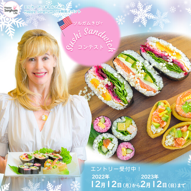 元ミス・ユニバース・ジャパン公式栄養コンサルタントのエリカ・アンギャルさんがヘルシー雑穀 アメリカ産ソルガムきびを紹介するWEBサイト「エリカ・アンギャルさんのHappy Sorghum Life ~ソルガムきびでヘルシー&ビューティー~(https://sorghum.jp/ericaangyal/)」を運営するアメリカ穀物協会(東京都港区虎ノ門 日本事務所代表 浜本哲郎、本部:ワシントンD.C.)は、昨年に続き、今年もフォロワー参加型のフォトコンテスト「ソルガムきびでSushi Sandwichコンテスト」(主催:アメリカ穀物協会 後援:アメリカ大使館アメリカ農産物貿易事務所)を、2022 年12月12 日(月)~2023年2月12日(日)の間、開催いたします。