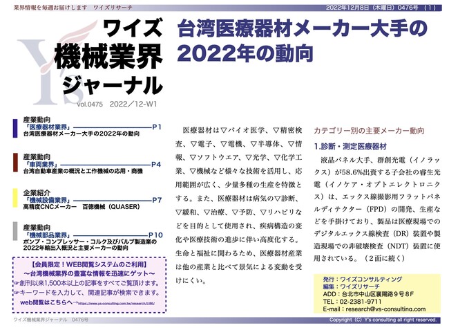 【台湾情報】台湾医療器材メーカー大手の2022年の動向<ワイズ機械業界ジャーナル2022年12月第2週号発行>