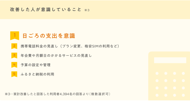 画像:「お金の意識調査2022(https://corp.moneyforward.com/news/release/20221206-mf-press/)」内、『マネーフォワード ME』を使って家計改善した人が日ごろ意識していること