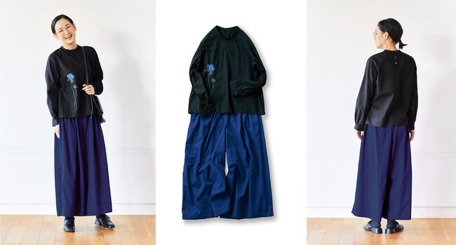 2輪のアネモネを刺しゅうしたトップスとキュロットパンツのセットです。黒地に青で刺しゅうしたアネモネの花は、キュロパンの色もさりげなくリンクしています。トップスのシンプルなラウンドネックの首もとは、後ろをボタン開ききにしているので、すっきりとした印象です。