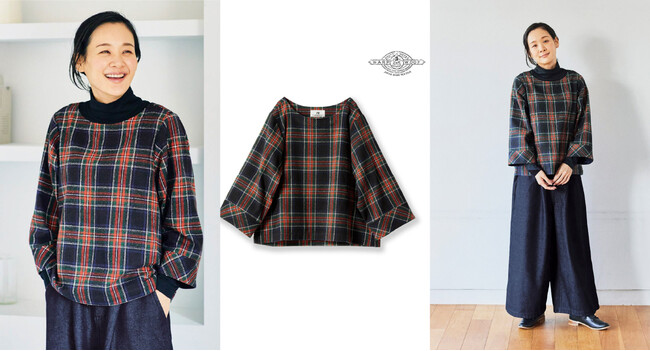 暖かな風合いの生地にチェックをのせたトップスです。シックな印象のチェックに、明るめの色がアクセントになっています。短めの袖に、衿ぐりと袖口が広めなので、タートルトップスを合わせてレイヤードも楽しめます。