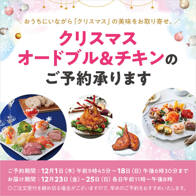取扱商品:オードブル、チキン、ローストビーフ、スイーツなど48アイテム(前年+28アイテム)※ご注文受付期間・お届け期間は、商品によって異なります。