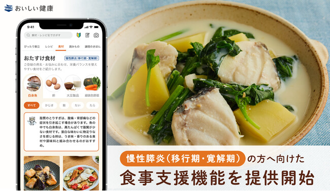 パーソナライズ献立提案・栄養管理支援アプリ『おいしい健康』を運営する株式会社おいしい健康はこのたび、慢性膵炎(移行期・寛解期)の方に向けた食事支援機能を提供開始したことをお知らせいたします。