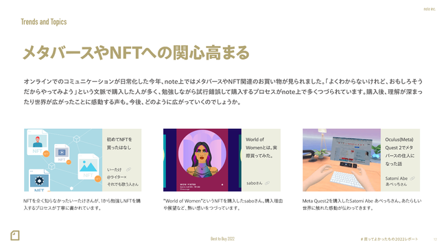 メタバースやNFTなど、新しい分野のものやサービスを学びながら購入し、体験をつづった記事が多く見られました。