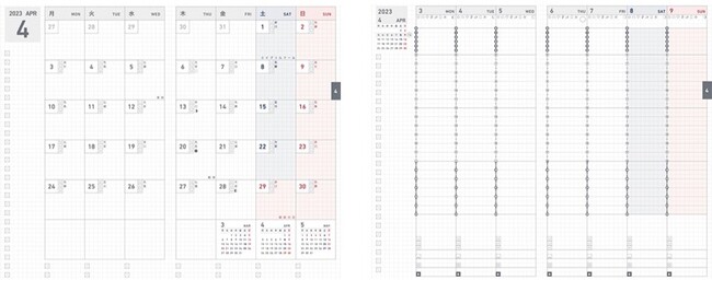 月の予定を一覧できるブロック型スケジュールの「月間ブロック」ページと、24時間軸を採用した「週間バーチカル」ページ。どちらも方眼罫なので、項目ごとの記入がキレイに書けるようになっています。