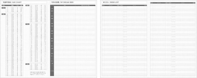 仕事や人間関係の目標などカテゴリーに分けて一年間で達成したいことを書き込める「2023年の目標」ページ。読みたい(読んだ)本、観たい(観た)映画などを記録できる「本リスト&映画リスト」ページ。フェイスマークを付けて評価や感想も書けます。