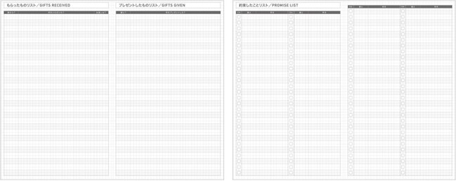 いただいたもの、贈ったものを記録しておけるリスト「プレゼントリスト」ページ。誰かとの約束や、自分との約束を忘れないよう書き込める「約束したことリスト」ページ。など、人付き合いをサポートするコンテンツも備えています。