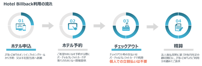 ビジネストラベルマネジメントと出張・経費精算管理ソリューションを提供する株式会社JTBビジネストラベルソリューションズ(以下「JTB-CWT」)と、企業に対する金融・決済サービスを提供する株式会社JTBビジネスイノベーターズは、Amadeus IT Group S.A.※1が開発する、Conferma※2を搭載したホテルペイメントプラットフォームである「Hotel Billback」※3を日本で初めて導入し、株式会社JTBが発行するMastercard(R)のバーチャルクレジットカードナンバー(以下「VCN」)※4によるホテル予約と精算代行のサービス提供を開始いたします。これにより、ホテル予約から精算までをワンストップに行うことが可能となり、海外出張時の利便性が高まります。