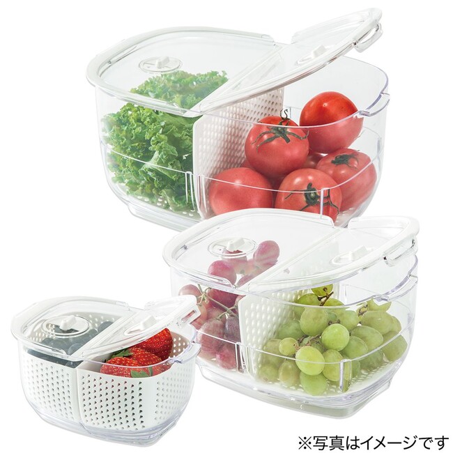 野菜や果物を洗って、そのまま冷蔵庫で保存できる容器。お客様からは、野菜の鮮度を維持できて、持ちが良くなったという声を多数いただいております。使いたいときにすぐ使えるので、時短便利アイテムとしてもおすすめです。冷蔵庫内の整理整頓にもぴったりで、年末年始の大掃除に大活躍いたします。