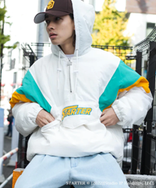 今回のコラボでは、1971年にアメリカで誕生したスポーツウェアブランド『STARTER』の古き良きレトロ感のあるスポーティーさを加えたアイテムがラインナップ。コーデに取り入れると一気にトレンド感満載のコーデに仕上がります。