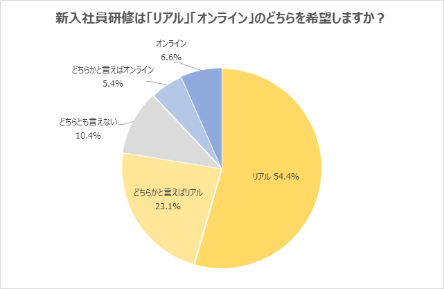 新入社員研修は「リアル」での参加を希望すると回答した新社会人が54.4%に上りました。「どちらかと言えばリアル」23.1%を合わせると、「リアル」での参加を希望する新社会人が8割に迫ります。入社式よりも「リアル」を希望する割合は7.6ポイント高くなっています。「慣れない環境で、オンラインだと質問しにくい」「名刺交換などはリアルのほうが習得できると思う」「リアルでの研修のほうが、会社の雰囲気に早く馴染めると思う」「一緒に研修に参加することで、同期との関係を築けると思う」といった声が寄せられました。