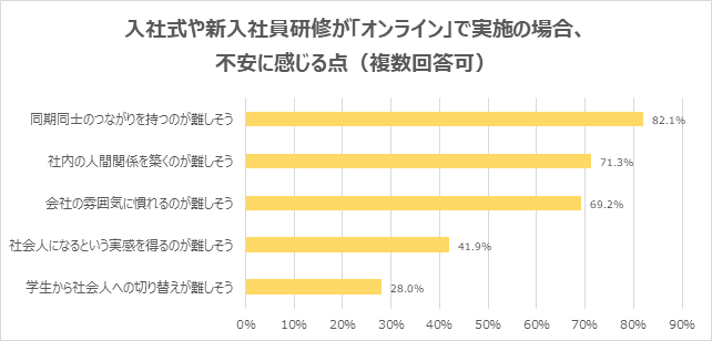 入社式や新入社員研修が「オンライン」で実施の場合、不安に感じる点は「同期同士のつながりを持つのが難しそう」が82.1%で最多。次いで、「社内の人間関係を築くのが難しそう」71.3%、「会社の雰囲気に慣れるのが難しそう」69.2%が続きました。