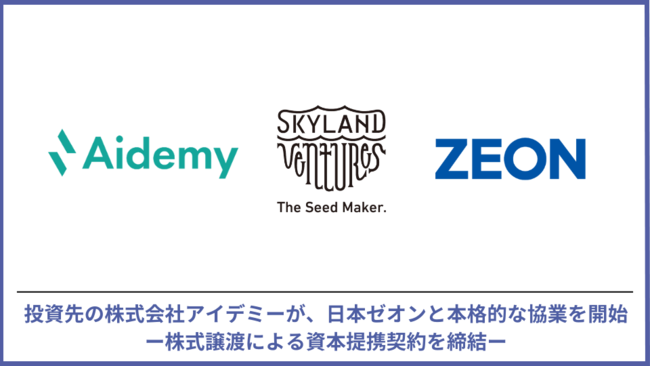Skyland Ventures(本社:東京都渋谷区、以下SV)の投資先、株式会社アイデミー(本社:東京都千代田区、代表取締役執行役員 社長CEO 石川聡彦、以下「アイデミー」)は、合成ゴムや高機能樹脂の製造・開発を行う日本ゼオン株式会社(本社:東京都千代田区、代表取締役社長 田中公章、 以下「日本ゼオン」)と資本提携契約を締結しました。また、日本ゼオンが、アイデミーの発行済みの株式の一部を Skyland Venturesからの譲渡により2022年11月28日に取得したことをお知らせします。