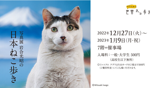 「写真展 岩合光昭の日本ねこ歩き」の開催にあたり、施設・従業員の感染拡大防止策の徹底はもとより、お客さまへのマスク着用、手指消毒、ソーシャルディスタンスの確保をお願いし、体調が優れないもしくは発熱時のご来場はお控えいただくようご協力をお願いいたします。また、会場内混雑時は入場制限を設ける場合がございますのでご了承ください。