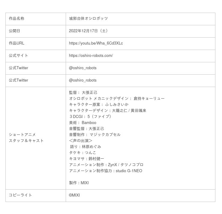 株式会社MIXI(東京都渋谷区、代表取締役社長:木村 弘毅)は、本年12月17日(土)にMIXI_ANIMEオリジナルコンテンツ第1弾となる『城郭合体オシロボッツ』のコンテンツサイト(http://oshiro-robots.com/)をオープンし、監督・大張正己によるショートアニメを公開します。