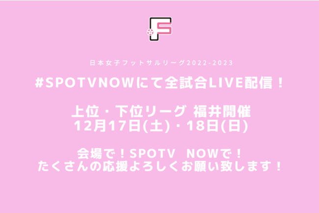 12月17日(土)、18日(日)に、福井県営体育館にて日本女子フットサルリーグ2022-2023 上位・下位リーグを開催します。今シーズンもSPOTV NOW(登録・視聴無料)にて全試合をライブ配信いたしますので、ぜひご視聴ください!
