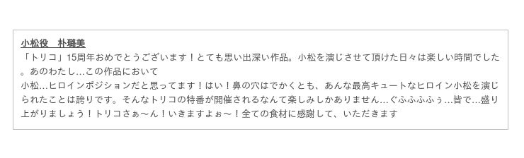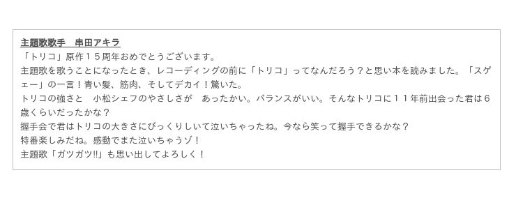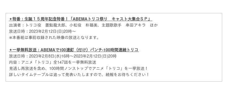 2023年2月12日(日)にアニメのキャストが出演する特番の放送がABEMAで決定!主人公トリコ役の置鮎龍太郎さん、トリコの相棒となる料理人・小松役の朴璐美さん、そして力強い主題歌でアニメを盛り上げた歌手の串田アキラさんが一堂に会して、「トリコ」の生誕15周年お祝いします! 当時を振り返るトークコーナーやアニメ化されていない原作のエピソードの公開アフレコ、そして串田アキラさんによる主題歌「ガツガツ!!」「豪食マイウェイ!! 」などのライブも予定!その他の豪華出演者も…?!また、特番放送前にはなんとABEMAで100時間のアニメ「トリコ」全147話一挙無料放送企画も!どうぞお楽しみに!